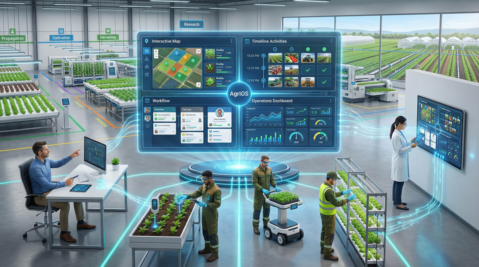 绿环芯耕是一家立足粤港澳大湾区的智慧农业科技公司,定位为“农业大模型驱动的种植决策与经营赋能平台”。我们以 AIoT 感测网络与边缘算力 为数据底座,结合 AgriOS 农业作业系统 与设备编排能力,打通“从田到家”的全链路闭环:生长预测、处方决策、灌溉/补光/卷帘等执行联动、品质分级与溯源、冷链履约,以及碳足迹与绿色指标沉淀。